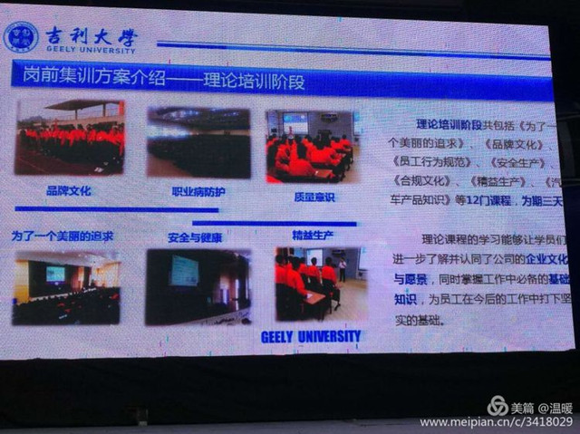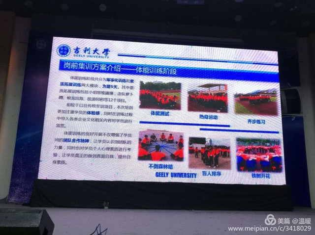 在座的各位學(xué)員,今天你們能加入這樣一個(gè)優(yōu)秀的企業(yè),通過(guò)集訓(xùn),成為它的一員,這是吉利的榮幸,也是你們的榮幸,更是你們的機(jī)遇。你們以前在學(xué)校學(xué)到的更多的是書(shū)本的理論知識(shí),我相信,通過(guò)為時(shí)倆周時(shí)間的培訓(xùn)。你們的體能將更加的強(qiáng)健,你們的意志將更加的堅(jiān)強(qiáng),你們的作風(fēng)會(huì)更加的優(yōu)良,你們的專業(yè)技能會(huì)得到大幅的提升,你們的團(tuán)隊(duì)協(xié)作的精神會(huì)大大的增強(qiáng)。吉利集團(tuán)雄厚的實(shí)力,先進(jìn)的技術(shù),高效的管理,完善的制度,都將是你們學(xué)之不盡,用之不竭的精神財(cái)富,希望你們?cè)谶@里能學(xué)有所成,成為一名真正的吉利人。
