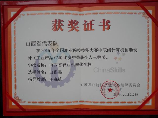 全國35個(gè)省市61所中職學(xué)校共160名選手參加了本項(xiàng)比賽,山西代表隊(duì)由山西省農(nóng)業(yè)機(jī)械化學(xué)校、太原市財(cái)貿(mào)學(xué)校、太原市信息技術(shù)學(xué)校、古交市職業(yè)中學(xué)、太谷縣職業(yè)中學(xué)5所學(xué)校組成。在4小時(shí)的激烈角逐中,白倡昊同學(xué)憑借學(xué)校培養(yǎng)的扎實(shí)基本功,克服了省賽與國賽軟件不一樣的技術(shù)困難,為山西代表隊(duì)贏得了一個(gè)三等獎。