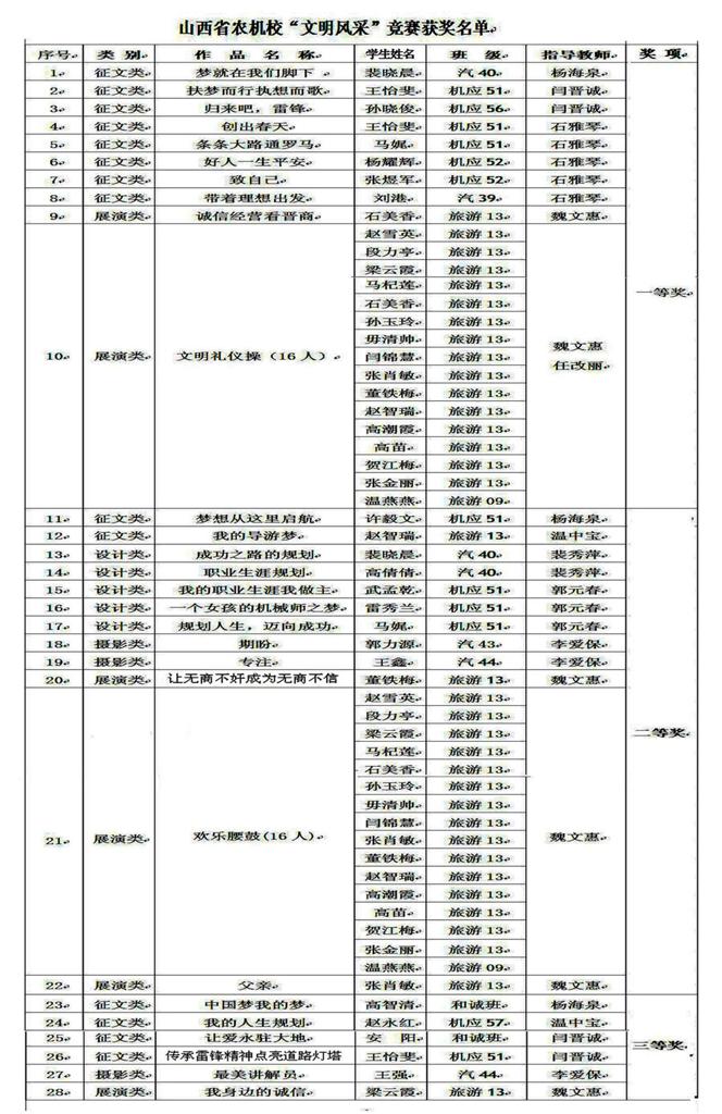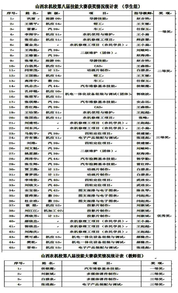 我校成功承辦了車工、鉗工、農(nóng)機修理等五項技能大賽,省人大副主任田喜榮、省政協(xié)副主席朱先奇、省教育廳廳長張文棟、省農(nóng)機局局長左義河等上級領(lǐng)導(dǎo)親臨我校賽場,為本屆大賽拉開了帷幕。同時,我校組織師生參加了18個項目的技能大賽,鞏麗等6名學(xué)生、侯銀鷹等1名教師獲得一等獎,11名師生獲得二等獎,14名師生獲得三等獎,16名師生獲得優(yōu)秀獎;參加了8項“文明風(fēng)采”競賽,共獲一等獎10個,二等獎12個,三等獎6個,優(yōu)秀獎4個;趙吉艷等27名教師獲優(yōu)秀指導(dǎo)教師獎,裴秀萍老師獲優(yōu)秀組織工作者獎。