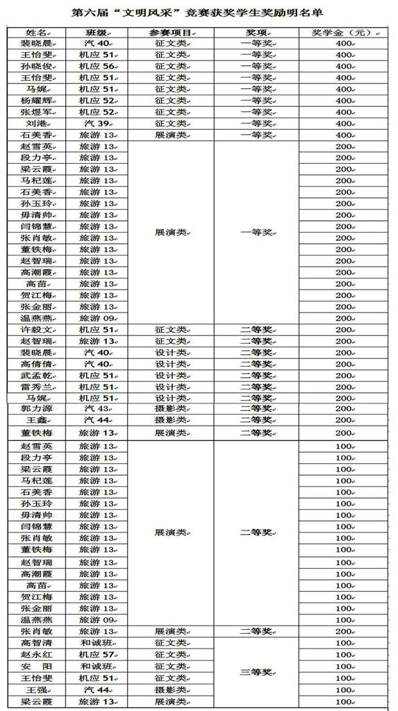 在山西省第八屆職業(yè)院校技能大賽和第六屆中職學校文明風采競賽中,我校學生展示了學校的教學成果,取得了優(yōu)異的成績。其中鞏麗等6名同學獲得技能大賽一等獎,王海航等10名同學獲得技能大賽二等獎,張琪琳等13名同學獲得技能大賽三等獎;裴曉晨等同學獲得文明風采競賽一等獎共10項,許毅文等同學獲得文明風采競賽二等獎共12項,高智清等同學獲得文明風采競賽三等獎共6項。經2013年4月2日校長辦公會研究決定,特對本屆技能大賽和文明風采競賽獲獎學生予以表彰并頒發(fā)獎金。望全體同學以獲獎學生為榜樣,強技強能,奮發(fā)努力;望獲獎同學再接再厲,爭取取得更大的成績。