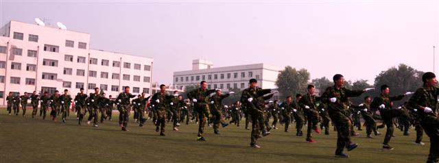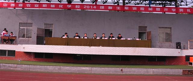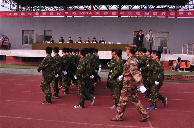 全體新生身著軍訓服,排成整齊的方陣,向迎來的軍旗行注目禮。高春寶校長、孫常青書記陪同山西省農機局人事教育處李新民副處長從主席臺走下來,檢閱新生方陣。軍訓連隊進行了分列式、綜合科目表演,最后幾百人組成軍體拳方陣,掀起了現(xiàn)代學子舍我其誰的雄壯氣勢。