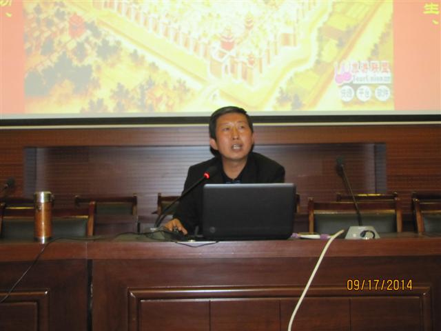 2014年9月17日晚,校團(tuán)委舉辦文化講壇第一期講座,邀請(qǐng)學(xué)校旅游教育研究室副主任、平遙縣非物質(zhì)文化遺產(chǎn)保護(hù)專家郝新喜老師為全校團(tuán)員講解平遙歷史和晉商文化。