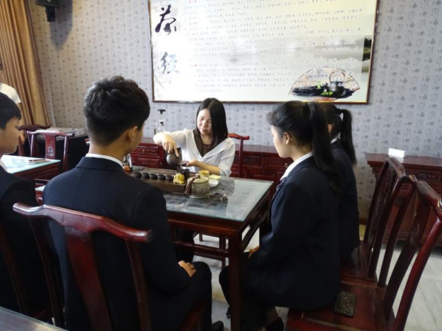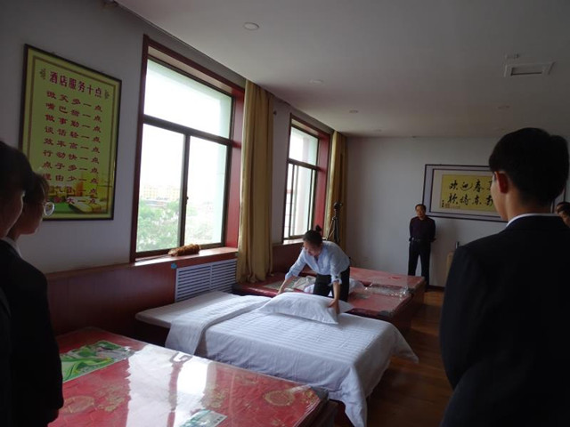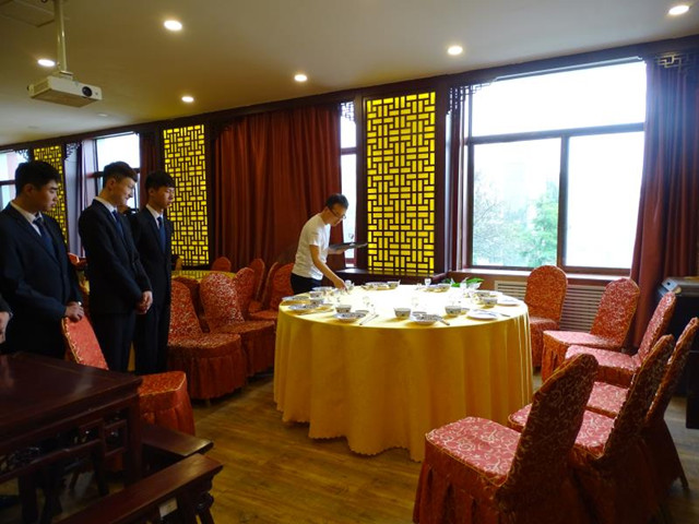 旅游教研室舉辦的青年教師技能展示由陰子旭老師牽頭,旅游14班全體學(xué)生以及相關(guān)教職工參加,同時(shí)彭永寧副校長(zhǎng)和王小扁副校長(zhǎng)蒞臨指導(dǎo)。具體展示項(xiàng)目有郗婷偉老師的中餐擺臺(tái)、慕中華老師的中式鋪床和馬虹老師的茶藝表演。郗婷偉老師為在場(chǎng)的學(xué)生以及老師演示并詳細(xì)地講解了撒網(wǎng)式鋪設(shè)臺(tái)布、餐碟定位以及湯碗、湯勺、味碟、筷子、酒杯等的擺設(shè),擺臺(tái)技術(shù)嫻熟,講解幽默風(fēng)趣,引來(lái)陣陣掌聲以及歡笑聲。慕中華老師將中式鋪床的甩單、包角、做夜床等環(huán)節(jié)的要領(lǐng)講解地細(xì)致入微,整個(gè)操作過(guò)程動(dòng)作嫻熟、敏捷,姿態(tài)優(yōu)美。馬虹老師則是用表演的形式將烏龍茶的沖泡方法展現(xiàn)給學(xué)生,在濃濃的茶香和美妙的音樂(lè)聲中結(jié)束了表演,讓學(xué)生們感受到中國(guó)茶道的魅力所在。
