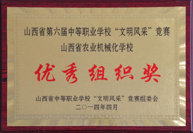 我校在2014年全省第八屆職業(yè)院校技能大賽和第六屆中等職業(yè)學(xué)校“文明風(fēng)采”競賽中,組織得力,社會影響較大,參賽成績優(yōu)異,被大賽組委會授予山西省第八屆職業(yè)院校技能大賽 “優(yōu)秀組織獎”,第六屆中職學(xué)?!拔拿黠L(fēng)采”競賽“優(yōu)秀組織獎”。
