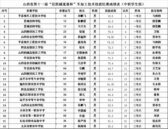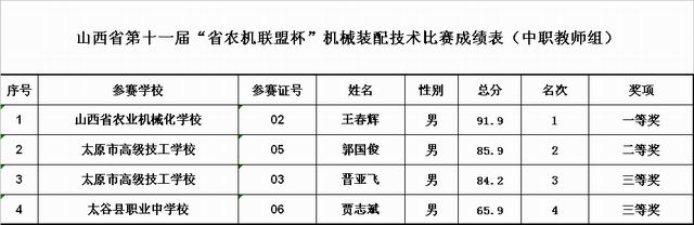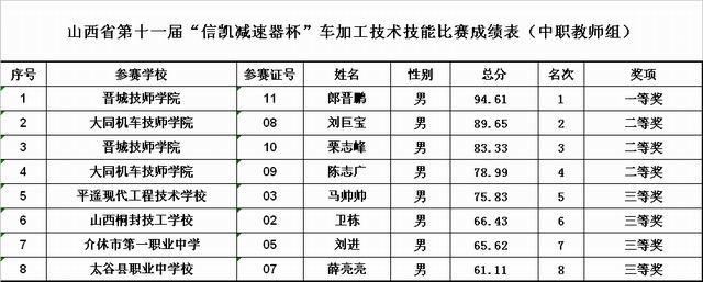 十一屆車加工技術(shù)、機械裝配技術(shù)技能大賽成績