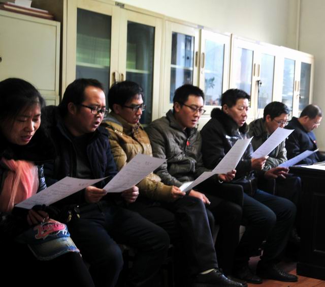 《國際歌》 “英特耐爾一定要實(shí)現(xiàn)”旋律的前奏激發(fā)出一聲穿透靈魂的慷慨激情:“我宣誓——我宣誓——我宣誓——!”然后是莊嚴(yán)的入黨誓詞加載進(jìn)激奮昂揚(yáng)的進(jìn)行曲旋律?;顒?dòng)中,全體黨員干部對(duì)照原唱細(xì)細(xì)聽、對(duì)照曲譜認(rèn)真記、對(duì)照示范專心學(xué),逐字逐句練、分批分組驗(yàn),最后匯聚一起,共同唱響入黨誓詞。